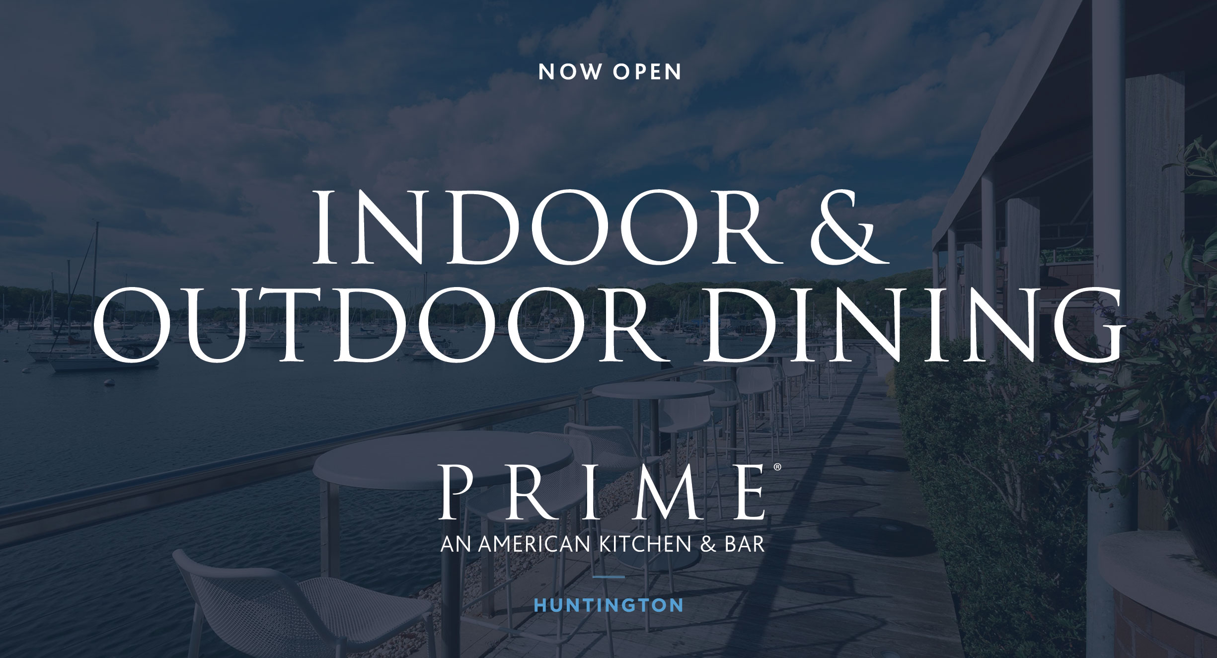 Enjoy 180-degree harbor front water views at Prime in Huntington. Their expansive outdoor patio and indoor dining room is now open for on-site dining!